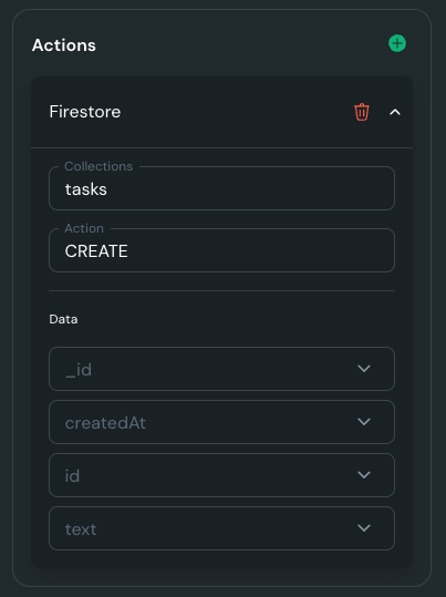 With the UPDATE action, you can modify a document in your Firebase collection. Simply select your preferred query (using a WHERE operation) and enter the updated data.